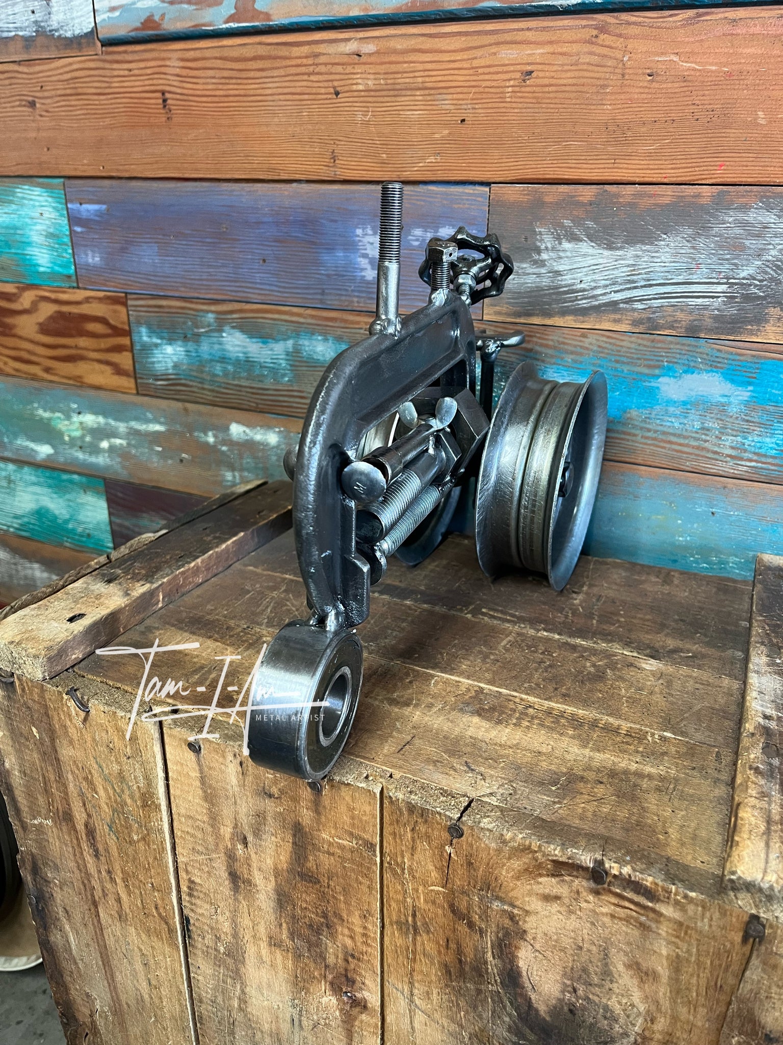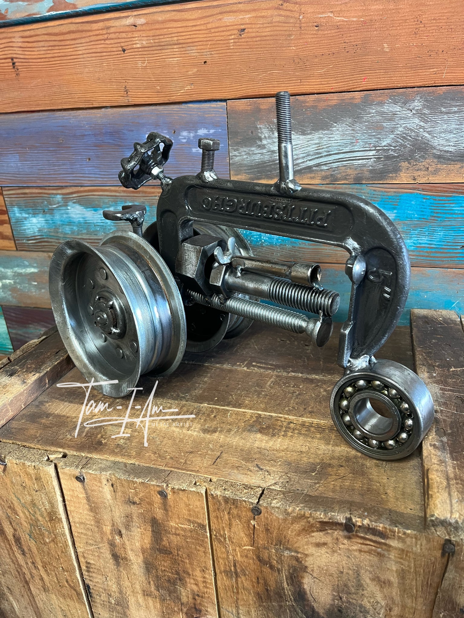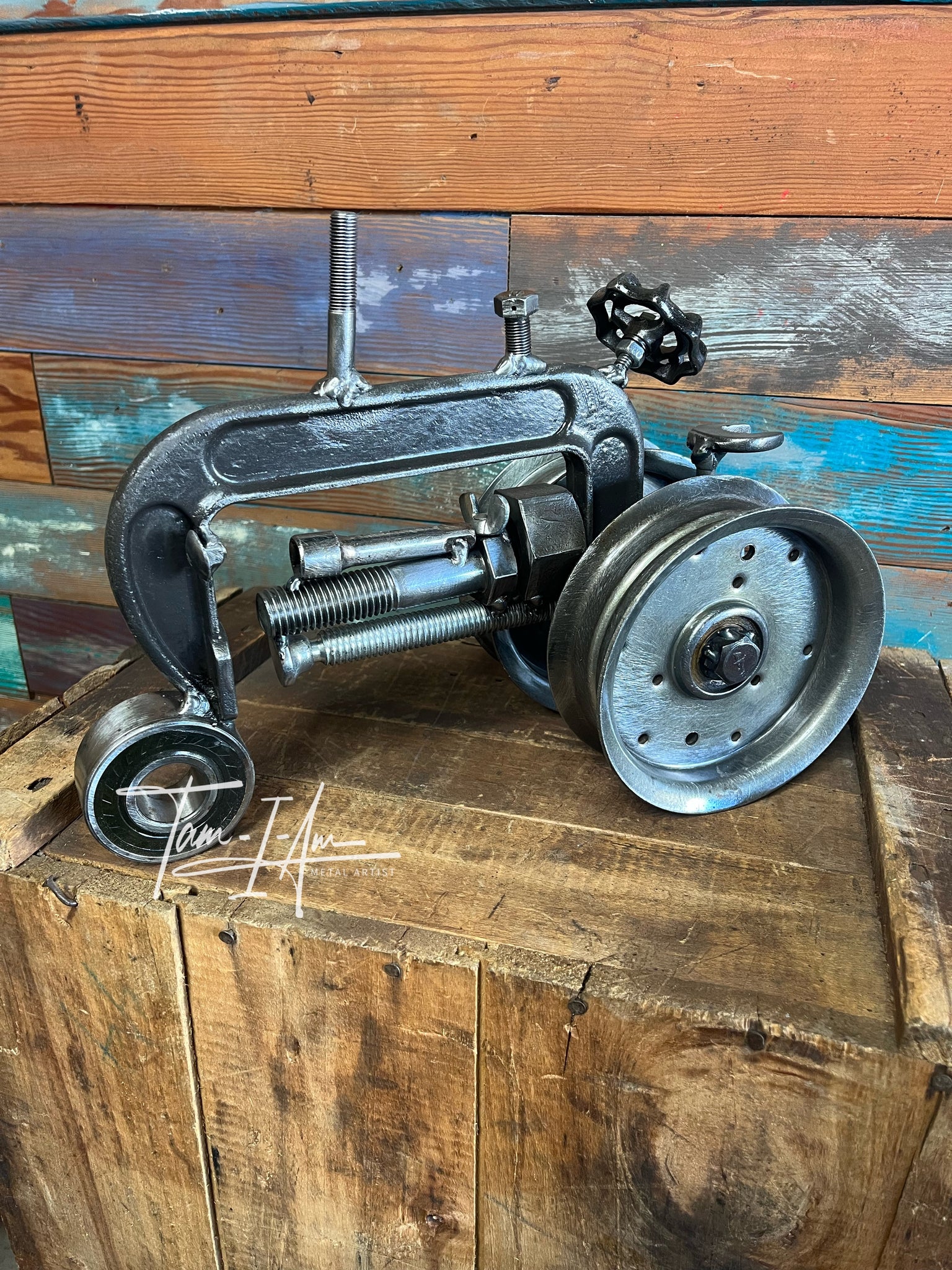 A tractor with a lot of heart—crafted from reclaimed metal parts that once worked hard and now tell a brand-new story.
