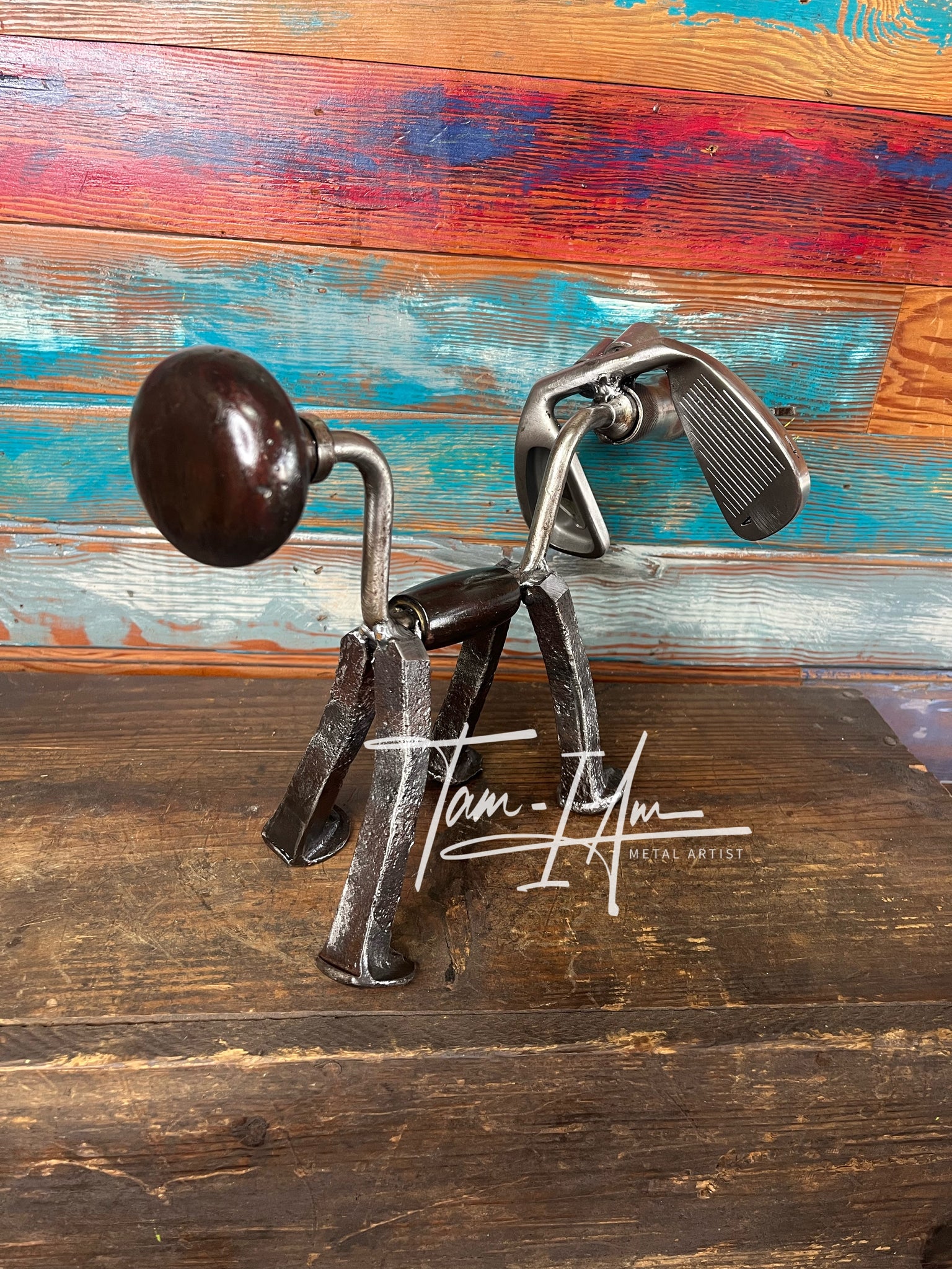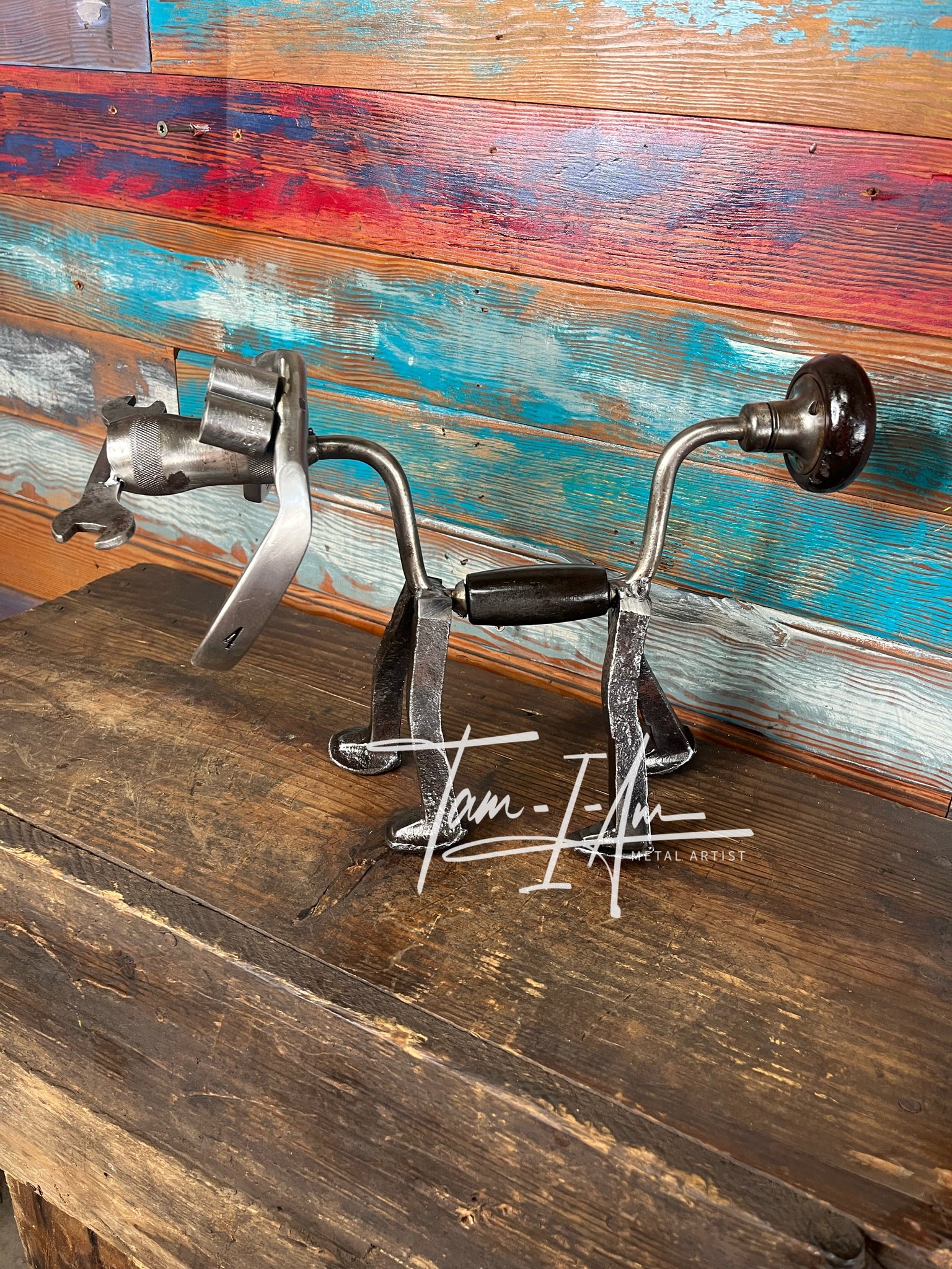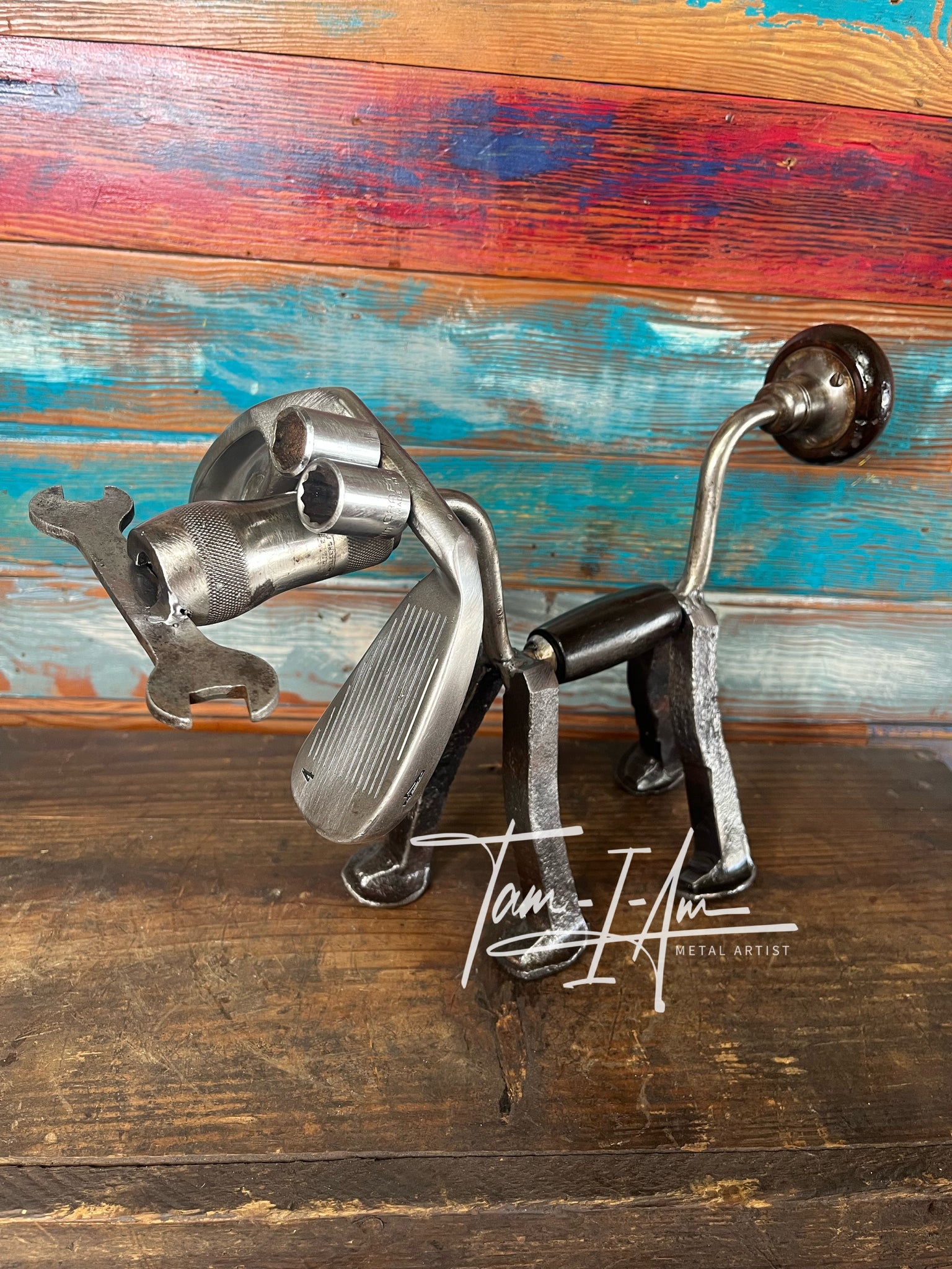 This is made from an old retired hand brace, also called a hand drill. I used old spikes for the legs, golf clubs for the ears, sockets for the eyes, and a tasty wrench for the bone.
