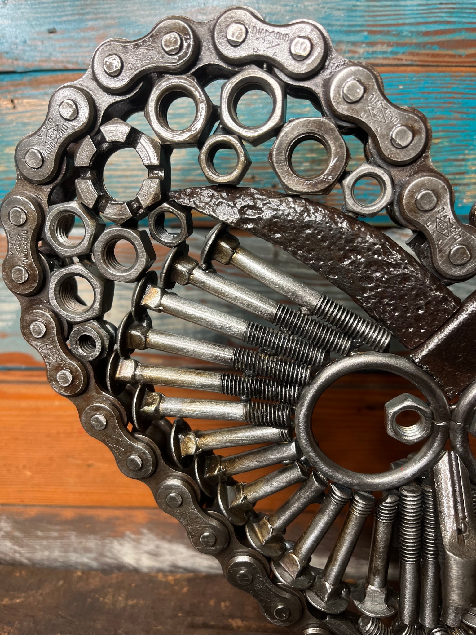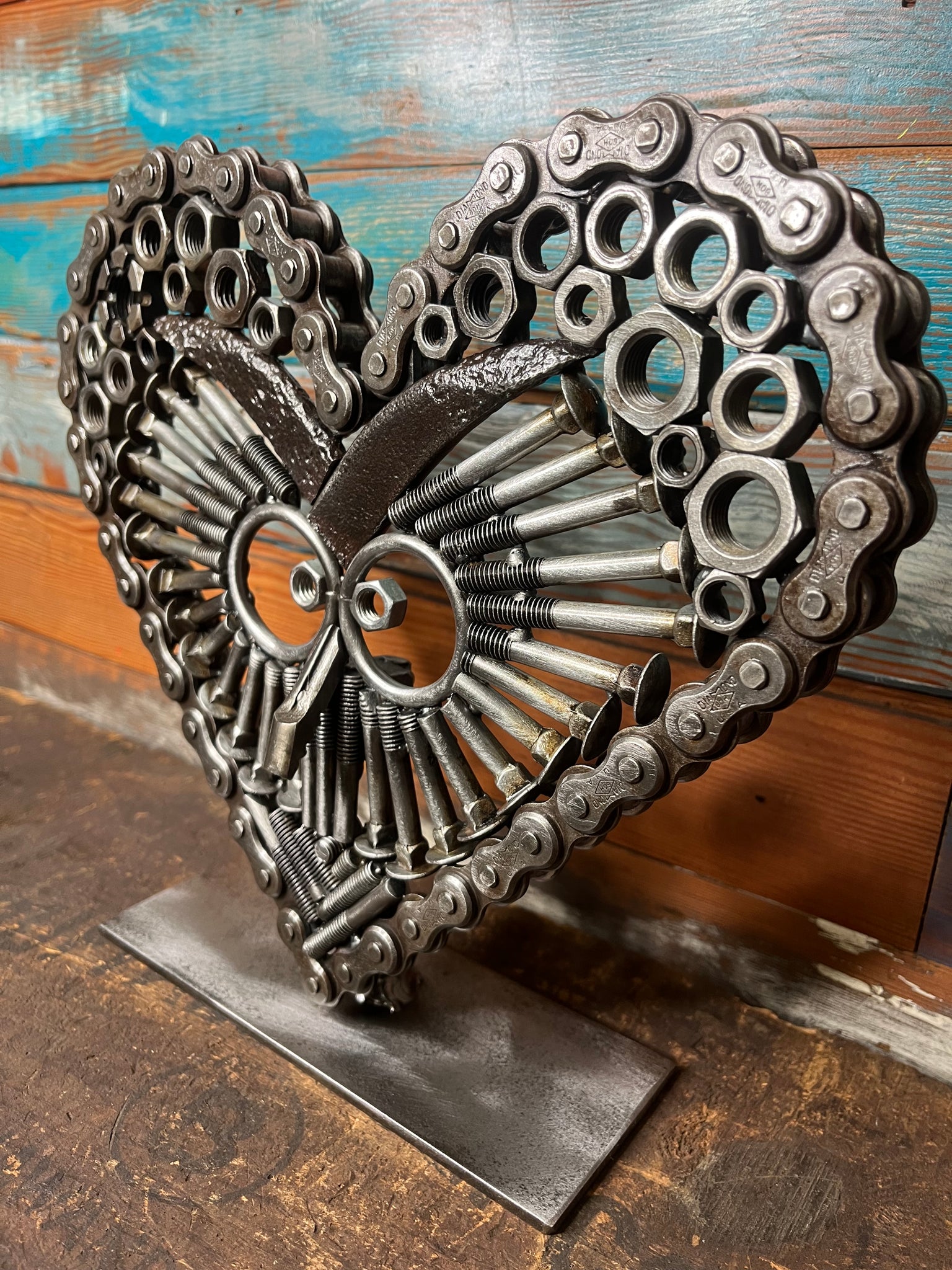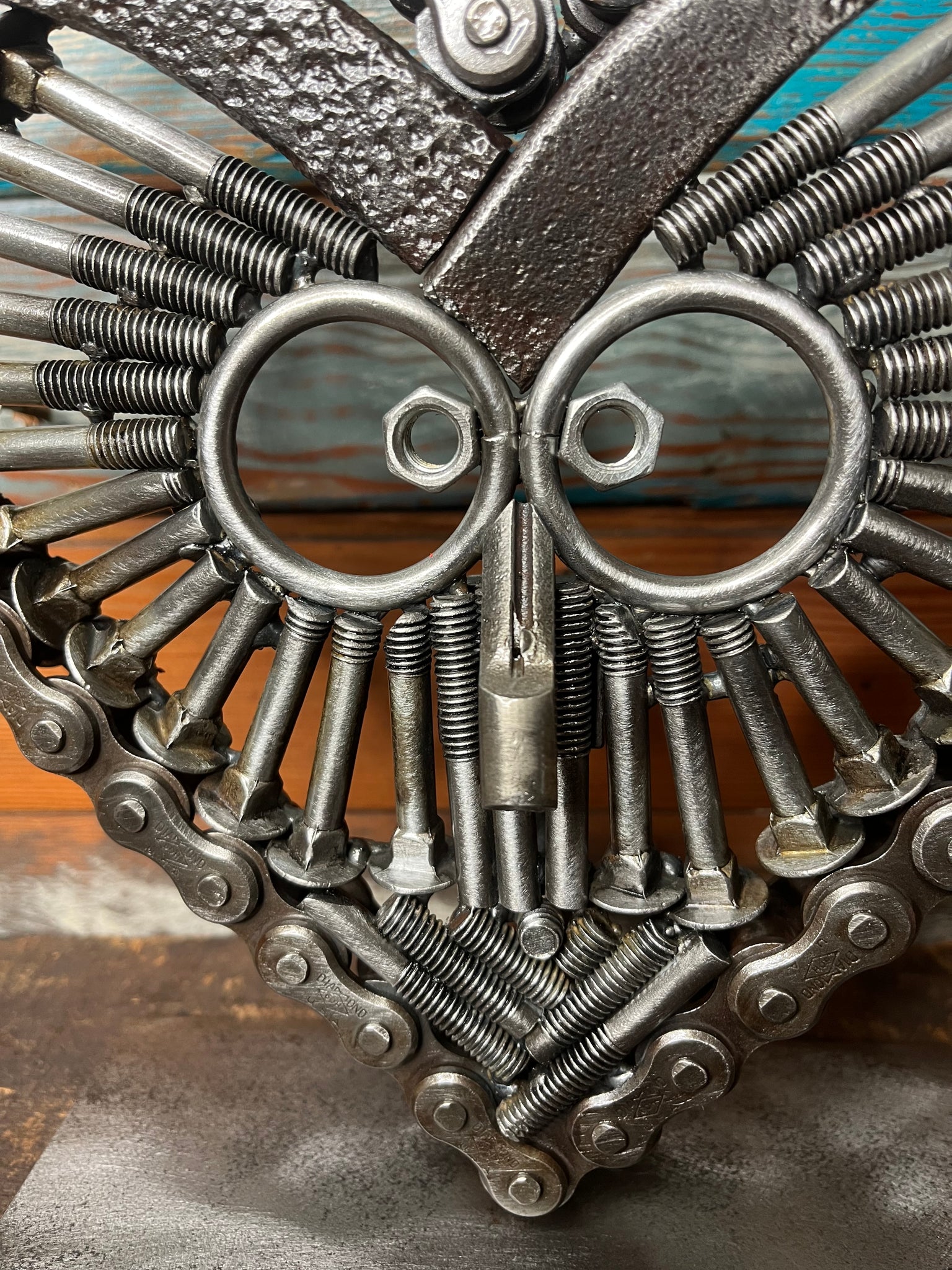 This very unique piece is perfect for owl collectors or anyone who enjoys a good conversation starter on display. It’s made from retired farm roller chain, nuts and bolts, and rotary hoe teeth.