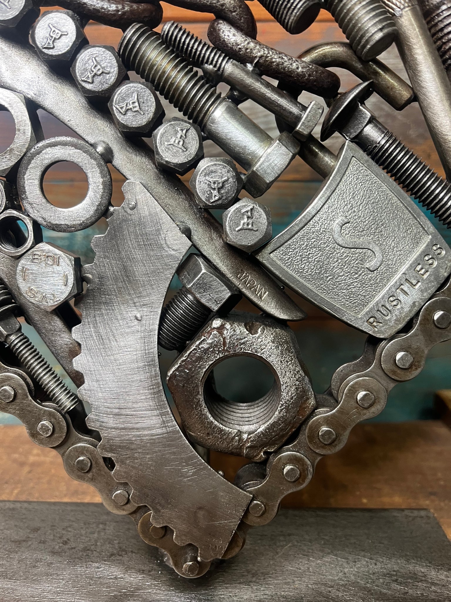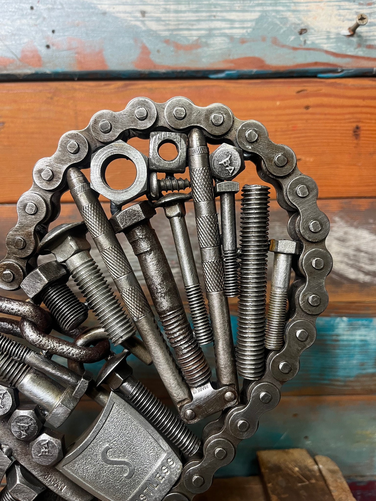 Crafted from reclaimed metals -- a leather punch, roller chain, a padlock, a section of chain, a nut cracker, and a plethora of nuts and bolts --this piece tells a story of newfound purpose. These formerly forgotten and discarded parts have been given new life in an art piece that celebrates yesterday's labors.