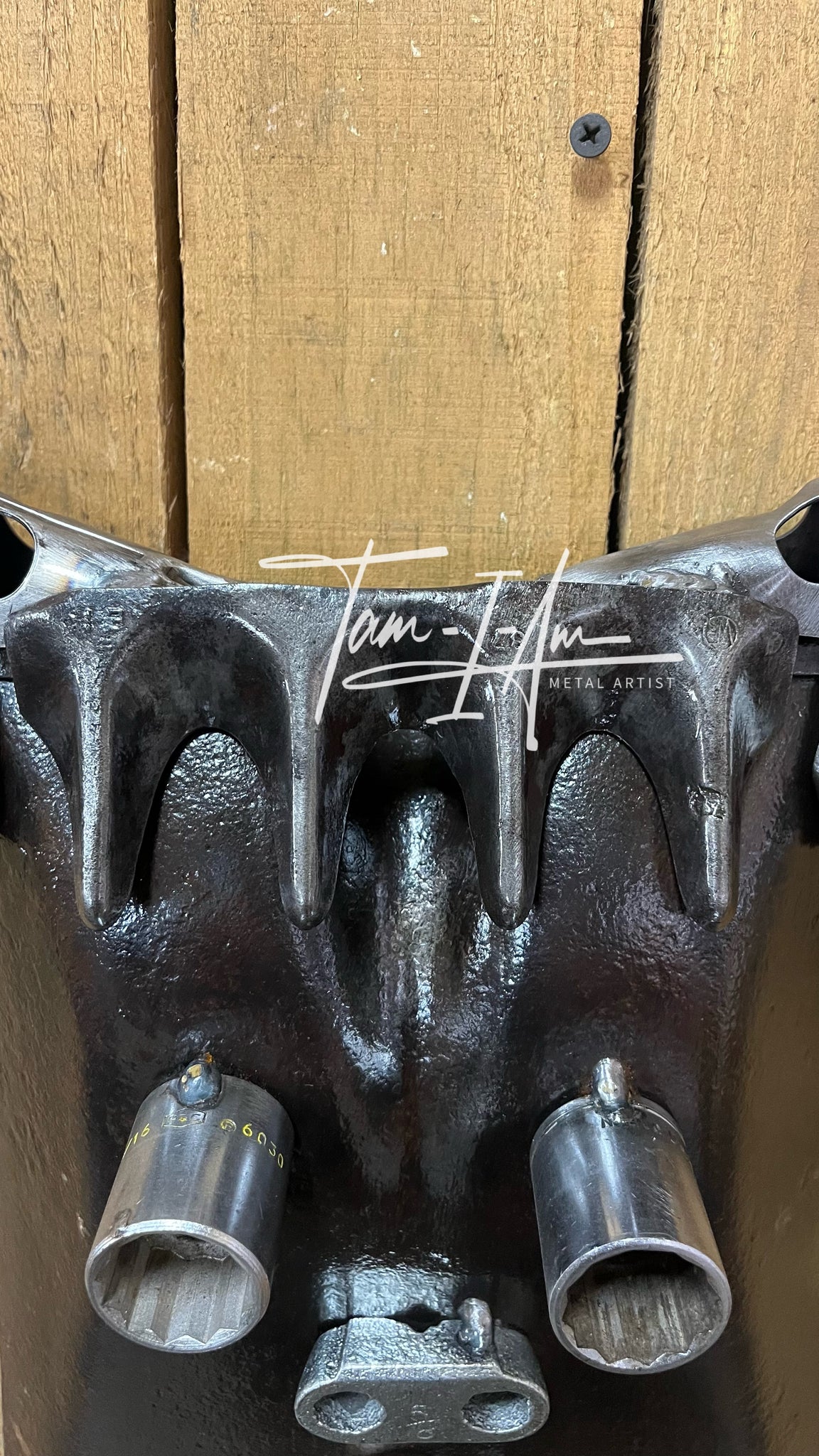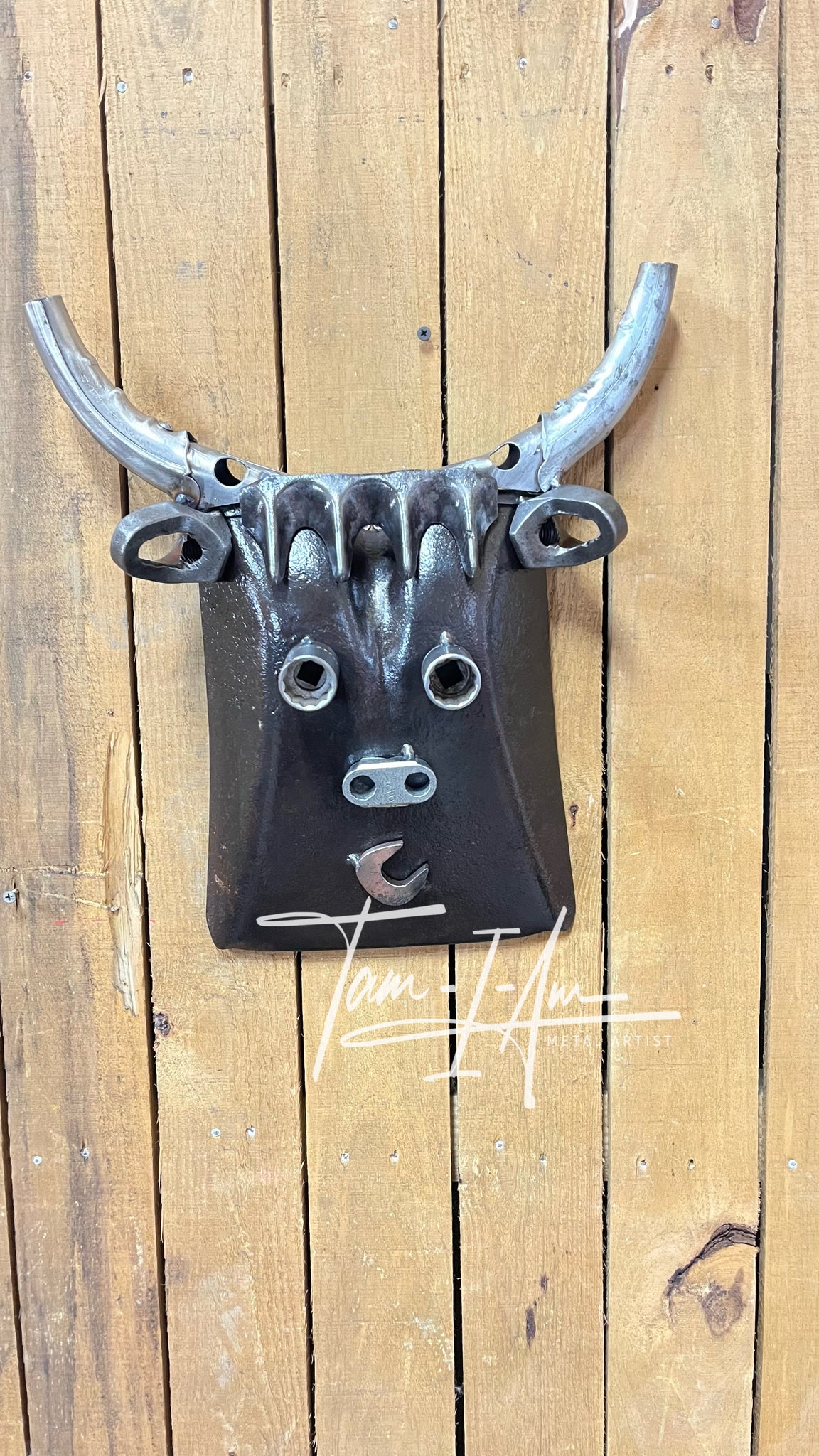 This fella is made from a plethora of old retired parts -- from his shovel head to his oil can spouts horns and everything in between. He's full of whimsy and is guaranteed to spark conversation wherever he's hung.